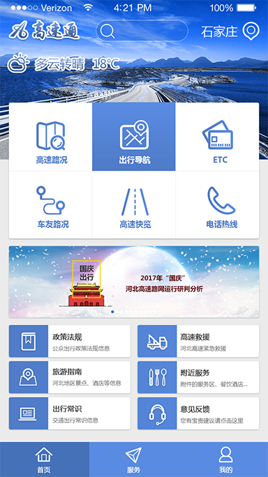 河北高速通APP程序提供了更为强大的路况查询功能,包括行车模式、出行导航、高速快览、ETC信息、路况随拍和附近服务等。